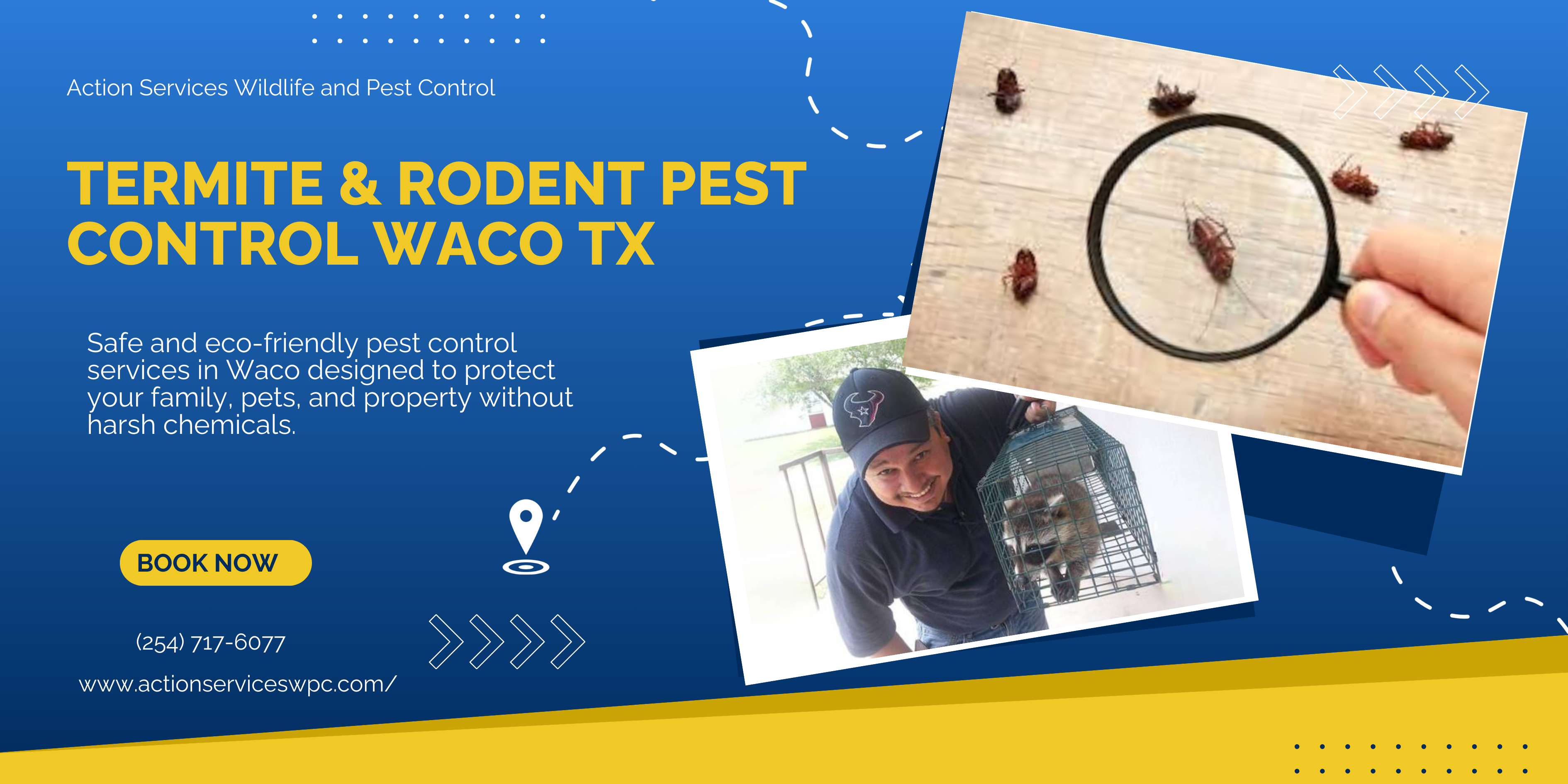Since 1994, Action Services Wildlife and Pest Control has provided reliable termite control, wildlife removal, and general pest management services throughout Waco and Central Texas. Our licensed team specializes in safely removing nuisance wildlife, eliminating termites, and controlling pests that threaten homes and businesses. We combine decades of experience with friendly, personalized service—large enough to respond quickly, yet small enough to treat every customer with genuine care and respect.