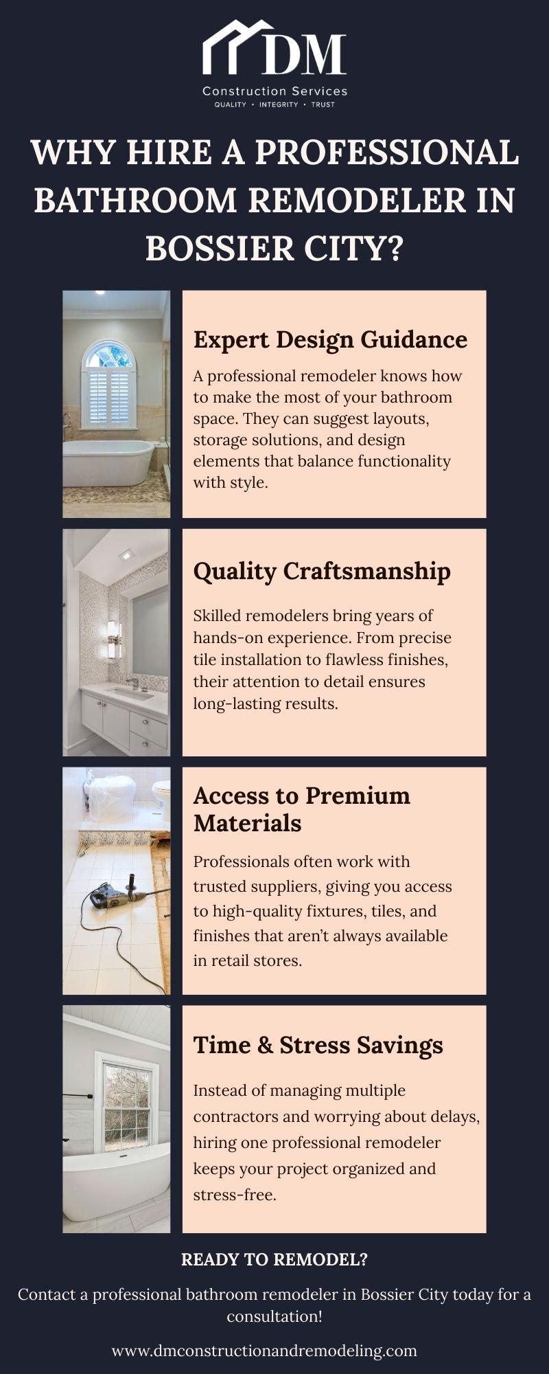 https://dmconstructionandremodeling.com/bathroom-remodeling/Why Hire a Professional Bathroom Remodeler in Bossier City? Hiring a professional bathroom remodeler Bossier City offers many benefits, from expert design guidance and quality craftsmanship to access to premium materials. A licensed remodeler ensures safe and efficient project management while saving you time and stress. Beyond creating a stylish and functional space, a well-done bathroom remodel also increases your home’s value, making it both a practical and worthwhile investment. https://dmconstructionandremodeling.com/bathroom-remodeling/0 Comments 0 Shares - Trusted Bathroom Remodeler in Bossier City