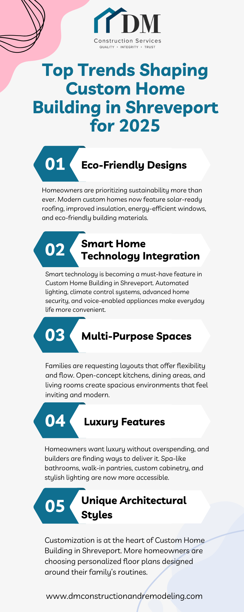 The top trends shaping Custom Home Building in Shreveport for 2025 focus on energy-efficient designs, smart home technology, open-concept layouts, and expanded outdoor living spaces. Homeowners are also embracing luxury finishes on practical budgets and choosing fully personalized floor plans that reflect modern lifestyles. These trends highlight the growing demand for comfort, sustainability, and customization in today’s custom homes. For expert guidance, contact DM Construction Services.