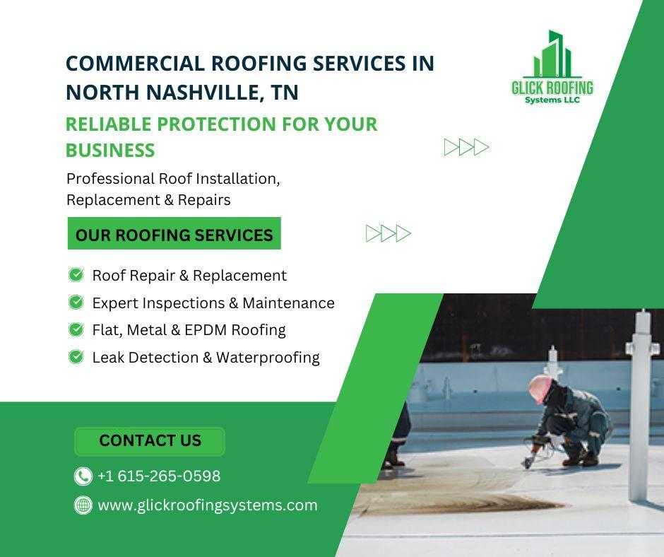 Professional commercial roofing services in North Nashville, TN, designed to protect and extend the life of your business property. Glick Roofing Systems offers expert solutions including roof repair, replacement, restoration, inspections, and preventive maintenance for all types of commercial roofs such as metal, single-ply, EPDM, and modified bitumen. Their experienced team focuses on delivering durable, energy-efficient, and cost-effective roofing systems tailored to your building’s needs. With advanced techniques and high-quality materials, these services help prevent leaks, improve performance, and ensure long-term protection for commercial and industrial facilities.