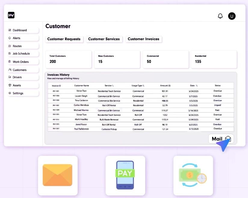 Haulvana's waste hauler software offers a complete customer handling module- view and manage customer requests, track service history, monitor invoice statuses, and handle billing for both commercial and residential garbage route clients, all from a single dashboard.