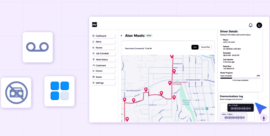 Haulvana's waste hauler software gives dispatchers complete real-time visibility — track active drivers on a live map, monitor garbage route progress stop by stop, view vehicle and schedule details, and communicate directly through the built-in communications log. The smarter way to manage waste routing software operations.