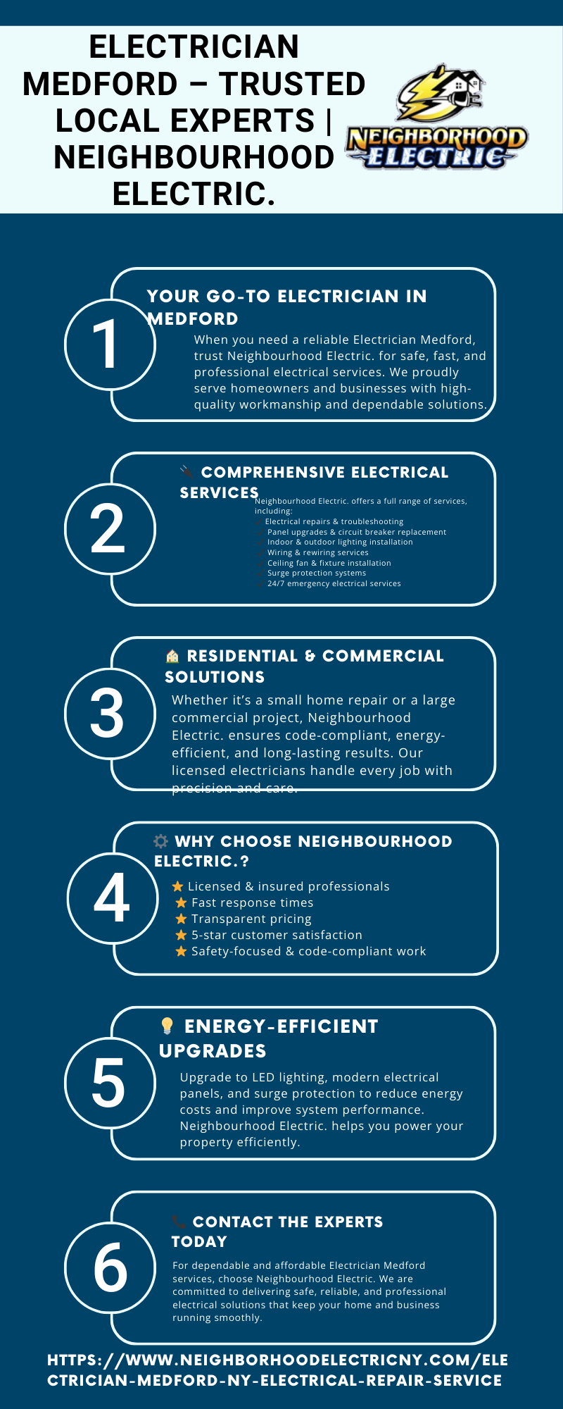 - When it comes to hiring an expert Electrician Medford, Neighborhood Electric stands out for professionalism and reliability. Electrical problems can disrupt your daily routine and even pose safety risks. Our skilled electricians provide fast diagnostics, accurate repairs, and modern electrical upgrades tailored to your needs. https://www.neighborhoodelectricny.com/electrician-medford-ny-electrical-repair-serviceWhen it comes to hiring an expert Electrician Medford, Neighborhood Electric stands out for professionalism and reliability. Electrical problems can disrupt your daily routine and even pose safety risks. Our skilled electricians provide fast diagnostics, accurate repairs, and modern electrical upgrades tailored to your needs. https://www.neighborhoodelectricny.com/electrician-medford-ny-electrical-repair-service0 Comments 0 Shares
