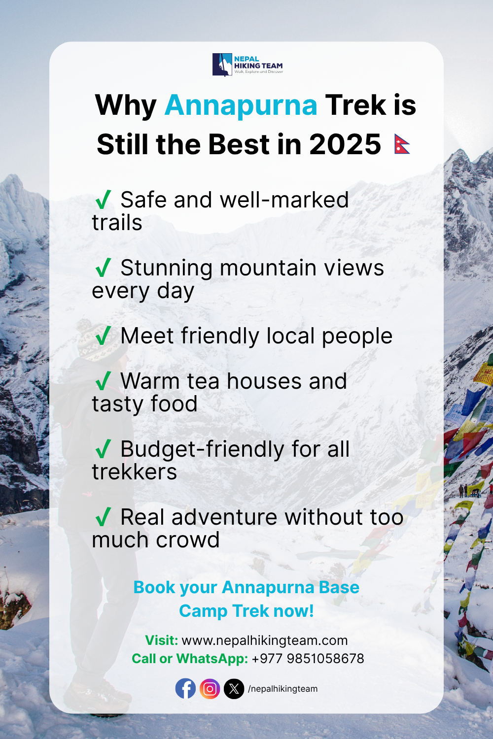 #AnnapurnaTrek2025 #TrekkingInNepal #NepalHikingTeam #NepalTrip #BestTreksInNepal #ABCtrek #HimalayaTrek #TrekNepal #Nepal2025Why Annapurna Trek is Still the Best in 2025 🇳🇵 Thinking of trekking in 2025? Annapurna is still the top choice! The trail is safe, views are stunning, and the local tea houses make you feel at home. It’s budget-friendly and not too crowded — great for both new and regular trekkers. Book 14 Days Annapurna Base Camp Trek Now: https://www.nepalhikingteam.com/package/annapurna-base-camp-trek Call or WhatsApp: +977 9851058678 #AnnapurnaTrek2025 #TrekkingInNepal #NepalHikingTeam #NepalTrip #BestTreksInNepal #ABCtrek #HimalayaTrek #TrekNepal #Nepal20250 Comments 0 Shares