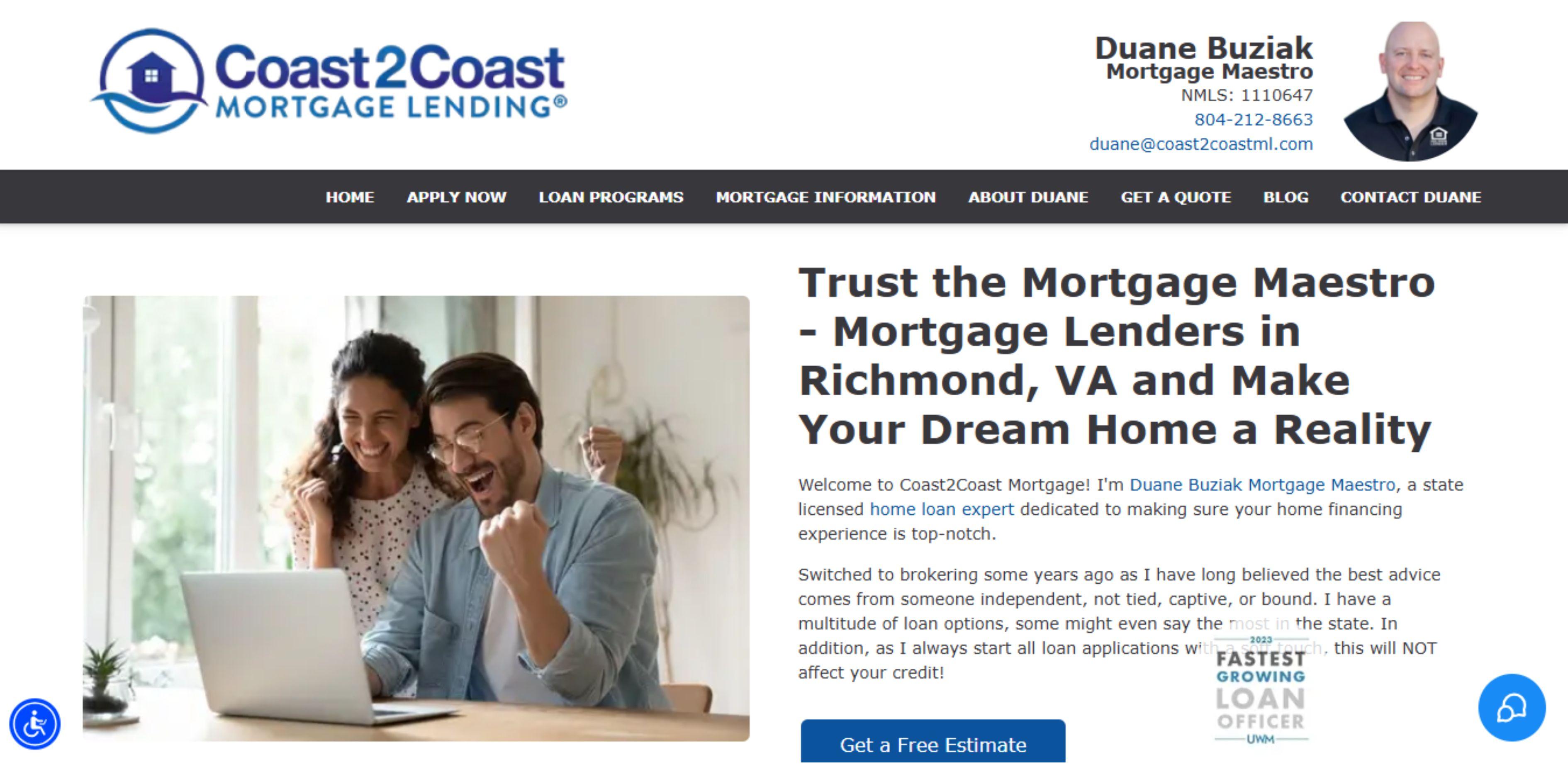Prequalify for a home loan without hurting your credit with Duane Buziak, your local Mortgage Maestro at Coast2Coast Mortgage. An experienced mortgage broker in Richmond, VA, offering flexible loan options and personalized service. Whether you're buying your first home or shopping for rates,let the most trusted Richmond mortgage lender help you. Contact now!