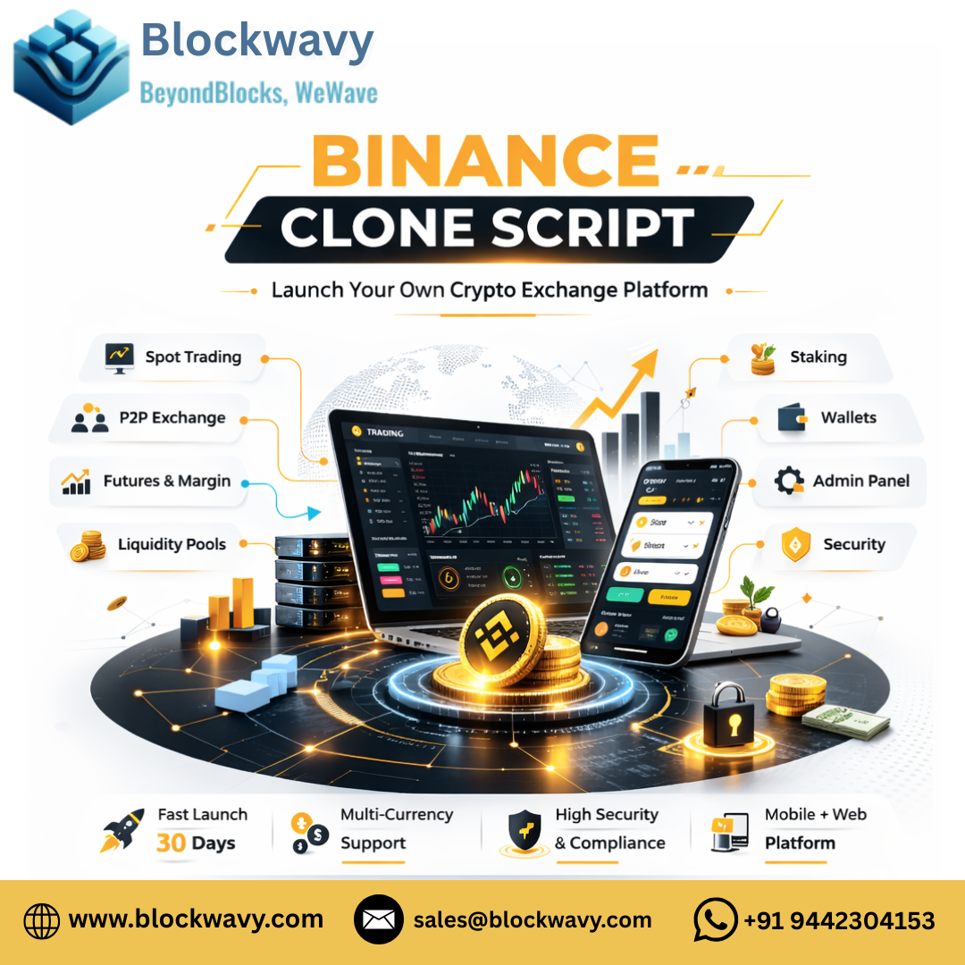 • Blockwavy is the leading firm providing a powerful Binance Clone Script designed for startups and crypto entrepreneurs. Our solution offers advanced trading features, strong security, seamless performance, and full customization to help you launch and scale your cryptocurrency exchange platform successfully.