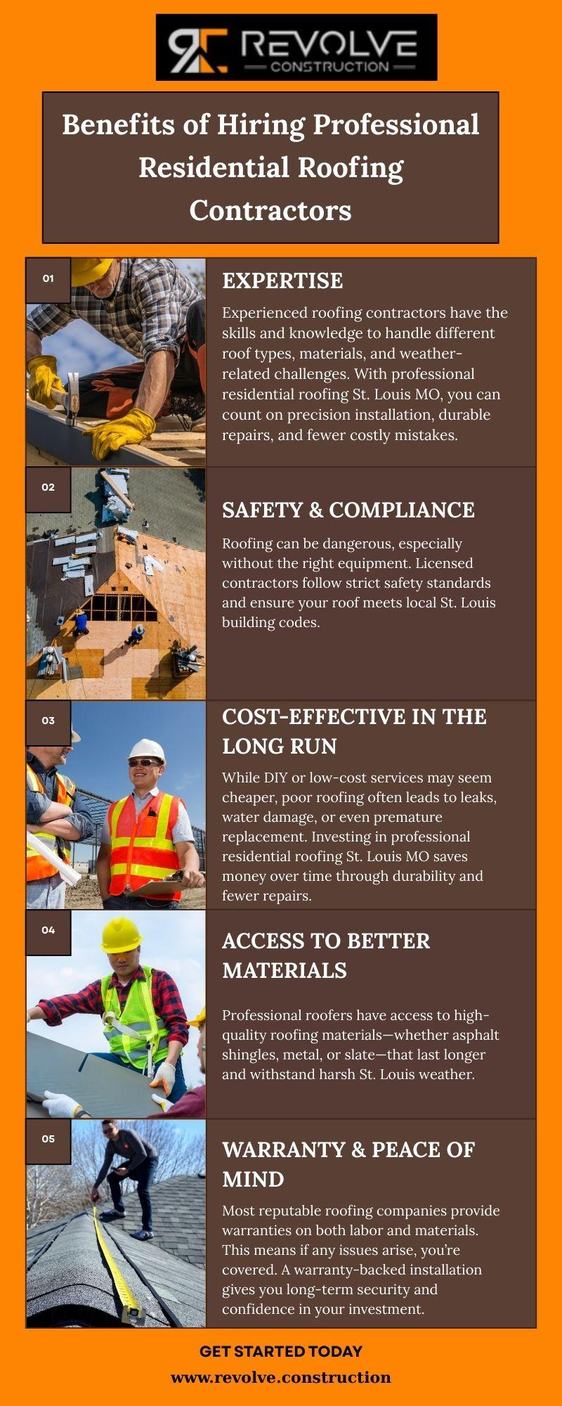 Benefits of Hiring Professional Residential Roofing Contractors Hiring professional residential roofing St. Louis MO contractors ensures expert workmanship, safety, and compliance with local codes. You’ll save money long-term with durable installations, access to high-quality materials, and warranty-backed services. Trusting professionals means peace of mind, better protection for your home, and lasting value for your investment. https://revolve.construction/top-residential-roof-installation-contractors-in-st-louis-mo/